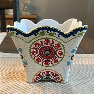 Vibrant ceramic planter with intricate patterns. Features blue, green, and red accents. Scalloped edge design. Genuine Stoneware crafted in Indonesia. Please see pictures for measurements.