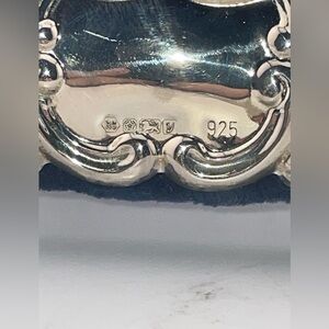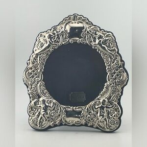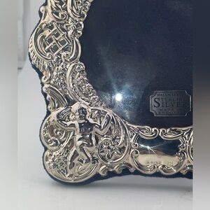 Showcase your favorite photograph with this sterling silver angelic scrolled photo frame with a velvet finish back. Signed RC, Lion (92.5% silver content) Passant Hallmark of an English Rose which indicates The frame was made in Sheffield and the “ V” Is significant in which indicates the frame was made in 1995. Great gift or a lovely addition to your collection.