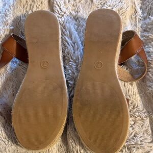 Stylish brown leather sandals with wedge featuring a secure ankle strap and woven sole. Worn but minimal wear!