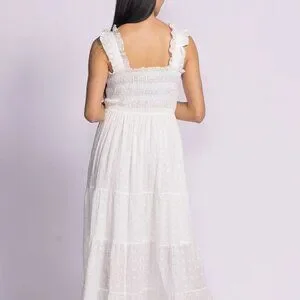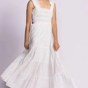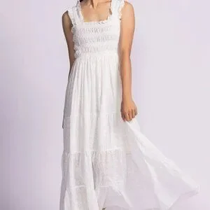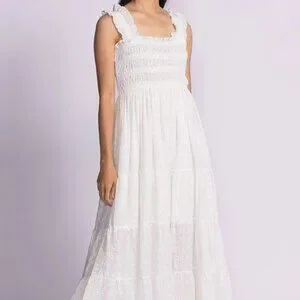 The Amber Dress features a stretch-to-fit elastic bodice, delicate eyelet fabric, and contrast trimmings—style it with strappy heels for a romantic, elegant look!