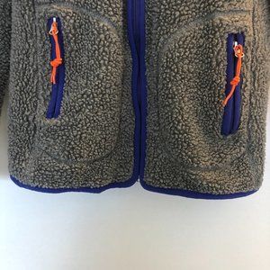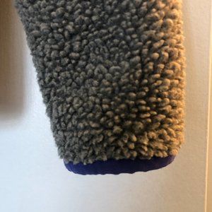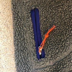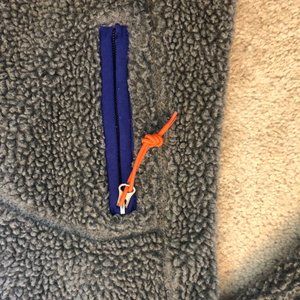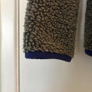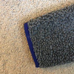 Cozy teddy jacket by Penfield. Features a vibrant blue hood and accents. Soft gray fleece body. Perfect for chilly days.