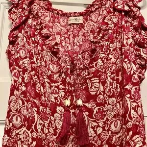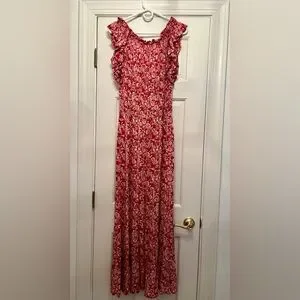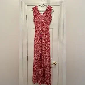 Chic red and pink floral design. Sleeveless with a flowing silhouette. Ideal for casual elegance.