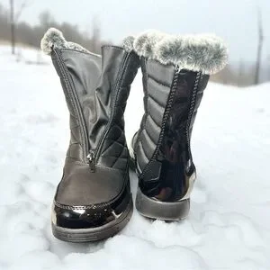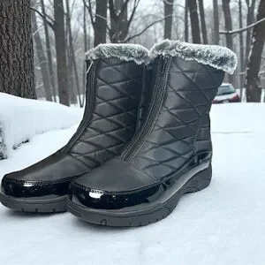 Stay warm and stylish this winter with these Weatherproof Since 1948 Esther boots in classic black. Brand new in box and never worn, these women’s winter boots feature quilted uppers, a cozy faux fur lining, and a front zip closure for easy on and off. The boots are finished with sleek patent-look trim and a durable weatherproof sole designed for traction in snow and icy conditions.