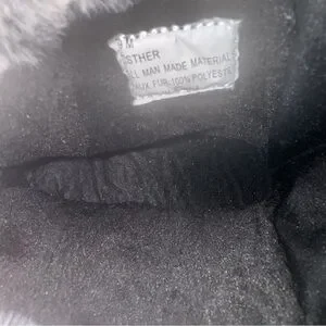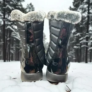 Crafted from all man-made materials with faux fur that lines the edges and black fur on the interior, these boots offer warmth, comfort, and functionality while maintaining a lightweight feel. The faux fur trim around the collar adds a chic touch, making them perfect for both casual wear and snowy outdoor adventures.