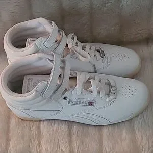 Crisp white Reebok sneakers for women. Perfect for any outfit. Comfortable and stylish.