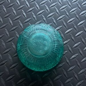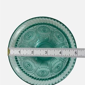 Beautiful vintage glass bowl in a striking teal color. Intricate design adds elegance.