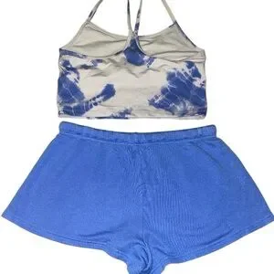 Set includes NWT blue fleece shorts size medium and matching blue & white tie dye sports bra... both by Offline by Aerie