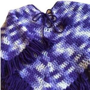 Handmade, knit purple poncho with fringe. Your little one will look adorable in this vintage item.