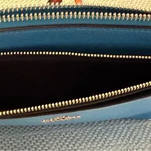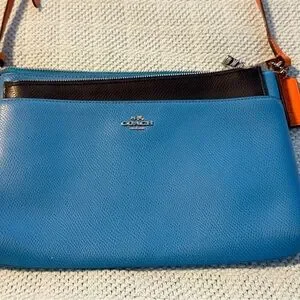 The COACH Azure Blue Leather Crossbody Bag with Orange Contrast Trim is a stylish and versatile accessory for women. This small rectangular bag features a zip closure and a shiny silver hardware, making it perfect for various occasions like travel, parties, casual outings, and business meetings. The vibrant orange handle adds a pop of color to the navy lining, while the designer Coach branding and colorful theme make it a standout piece. Crafted from high-quality leather, this crossbody bag is both fashionable and practical for everyday use.