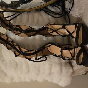 Step out in style with these elegant black lace-up heels. Perfect for any occasion, these shoes offer both comfort and sophistication. These heels are super sexy and gorgous ❣️ These are also basically brand new, they have a number on bottom of shoe, but these shoes are pristine inside and out, and they zipper in back and lace all the way up the calf❣️ Sexy black heels❣️