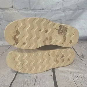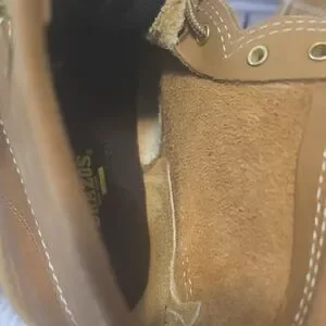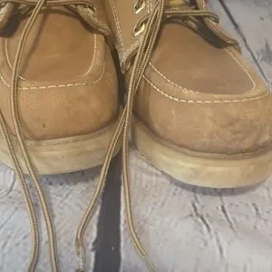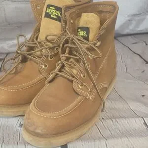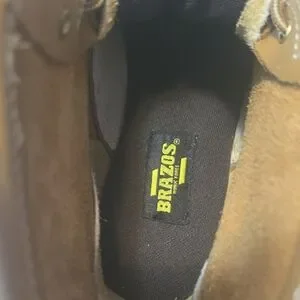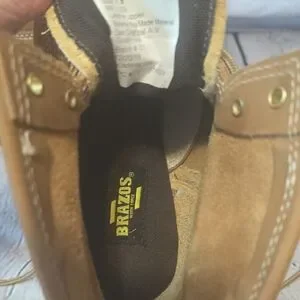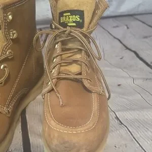 Brazos Work Force men's brown leather boots with memory foam cushion insoles. Size 7.5. Sturdy and durable. Leather upper and balance man made material is what is listed on the tag. Pre-owned. Please view photos as they are part of the description. There are scuff marks on both boots, and one shoe string end is cracked. There is still a lot of life left in these boots, I just got tired of tripping over them. So here they are listed. I will dust off the dirt on the bottom of the soles before shipping but leave any other cleaning to the buyer.