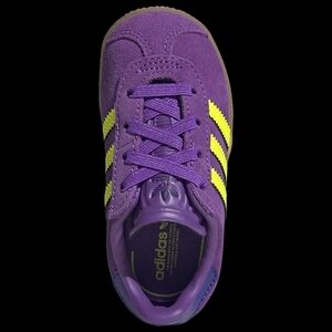 Vibrant purple Adidas Gazelle sneakers with striking yellow stripes. Ideal for everyday style. Perfect for back to school. I have only size 5K/5C left!