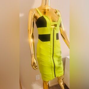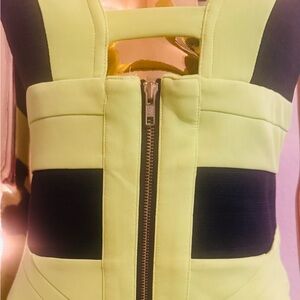 Bold neon yellow dress with black accents. Features a front zipper for a sleek look.