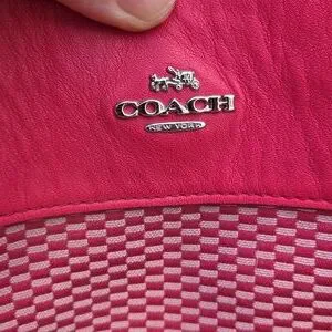 Coach Lexi red and white Jaquard canvas and leather shoulderbag. Coach style number A1781-F57540 $498 retail. Excellent used condition. Has original hangtag. Silver hardware. Two shoulder straps with red on the exterior and brown on the interior. Red and white checked fabric and smooth leather. Maroon/burgundy fabric lining. No rips, tears or stains to bag exterior or interior. Purse measures approximately 14 inches across by 10.5 inches high and 6 inches wide. Shoulder strap drop is approximately 10 inches. Comes from smoke free and cat friendly home. Accepting reasonable offers!