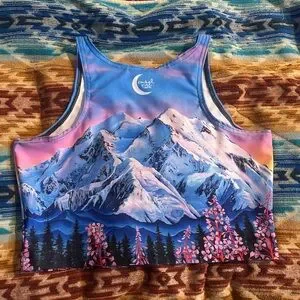 Vibrant crop top with mountain design. Features blue and pink hues.