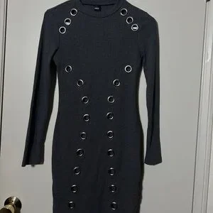 Stylish gray dress with striking silver eyelets. Long sleeves for a sleek look. Perfect for modern elegance.