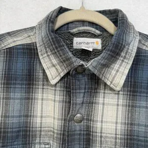 Carhartt Jacket Mens Medium Gray Blue Plaid Sherpa Lined Shirt Coat