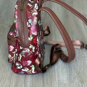 Charming Loungefly backpack with a floral Bambi design. Features vibrant magenta and brown colors. Perfect for adding a playful touch to any outfit. This item was lightly used, please see photos to view light wear.