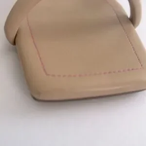 Features: Slip-on style, backless design, square open toe, two thin straps, leather fabrication, block heel, lined footbed.