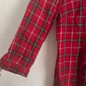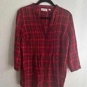Stylish plaid blouse with a V-neck. Features three-quarter sleeves. Perfect for casual outings.
