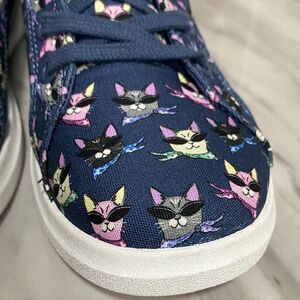BOBS from Skechers, cat print sneakers, animal print shoes, navy blue sneakers, casual lace-up, memory foam sneakers, pet rescue shoes, fun print sneakers, women’s size 7.5, comfy everyday shoes, lightweight sneaker, playful fashion shoes, cats