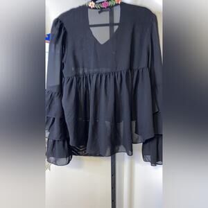 Black blouse with ruffles, long sleeve, embroidered with flowers, V neck