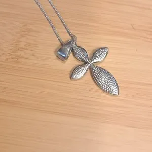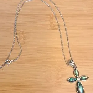 Elegant silver cross pendant necklace featuring stunning abalone accents. Perfect for adding a touch of sophistication to any outfit.