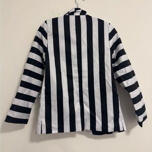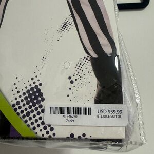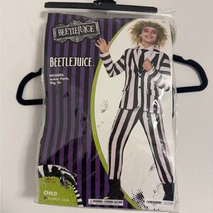 Dress up as Beetlejuice with this striped costume. Includes jacket, pants, wig, and tie. Ideal for Halloween fun. Great condition some spots on suit see pictures and white face paint on tie see pictures