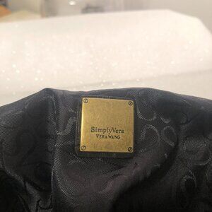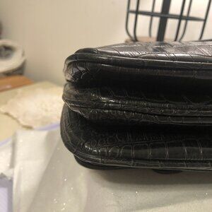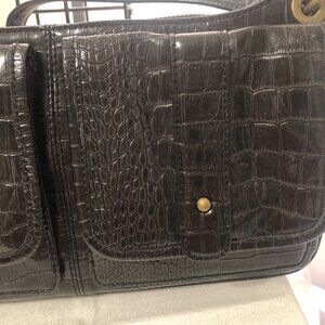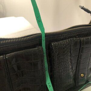 Black patent Croc with brass colored hardware. This bag is both unique and very spacious. Two outside pockets provide you access to those items you made need to get to quickly. The interior is lined with a beautiful black vera wang satin materal. Several interior slip pockets and zip pockets to get your items organized. Bag is in very good condition - no flaws, rubs, stains, or tears noted. The bag measurements are show in the pics.