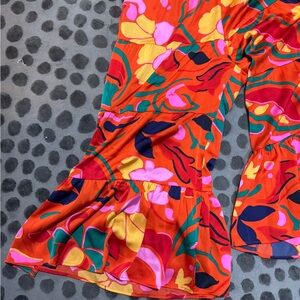 Chic floral tiered flare pants with vibrant red and pink hues. Ideal for a stylish statement. Silky fabric, flowy, wide legs, elastic waist band