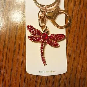 Elegant dragonfly key holder. Features red gemstones. Gold-tone finish. Perfect for adding charm to keys.