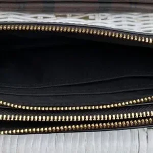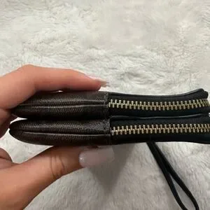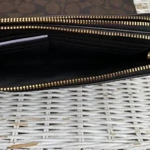 Coach large leather 2 gold zipper wristlet wallet in classic brown/black coach pattern Perfect condition, new without tags Large enough to hold your phone, cards, cash, chapstick, and keys. There’s so much room