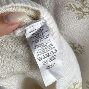 Elegant cream sweater with gold snowflake accents. Ideal for winter wear. In great condition barely worn. Has one small mark but it’s barely noticeable. It’s slightly thick and warm. Great for a cozy look this winter.