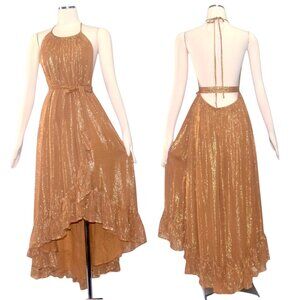 Beautiful dress perfect for vacation! Lightweight viscose and metallic outer fabric with cotton lining. Ruffle detail at bottom halter ties in back. Comes with matching sash belt. Low back style. Size is M/L. Excellent condition. A6