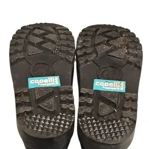 Durable black rain boots. Easy pull-on handles. Perfect for wet weather.