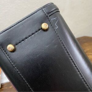Stylish Coach satchel in black leather. Features elegant gold hardware. Perfect for any outfit.
