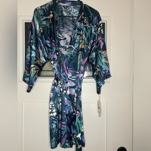 Elegant blue chemise with floral pattern. Features lace trim and adjustable straps.