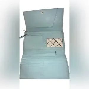 Chic Kate Spade clutch in soft blue. Perfect for versatile styling. Elegant and modern design.