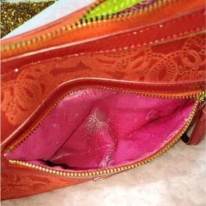 The inside is stunning with a beautiful pink color that just adds to the beauty of this purse. There is a zipper pocket and 2 slip pockets. There are signs of wear on the seam of the fabric, look at the pictures, and you will see the strings.