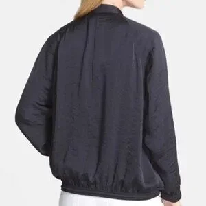 Moto styling goes soft and easy in a slouchy jacket with a lustrous look of hammered satin. The asymmetrical zip style is gathered to a stretchy waistband and adjustable drawstring toggles
