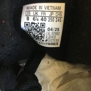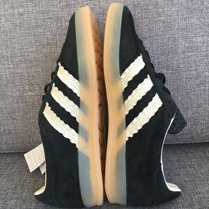 Adidas Gazelle Indoor Shoe in Core Black / Cream White / Gum. Super cool black suede trainers with subtle ruffle detail on the stripes and a lighter, semi-transparent sole than other styles’ brown gum sole. Adidas’ site says they’re TTS, but some reviewers recommend going down half a size. I did that - with an 8 vs 8.5/9 - and found they were a touch short but still wearable.