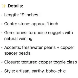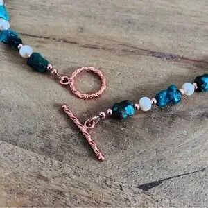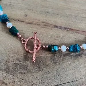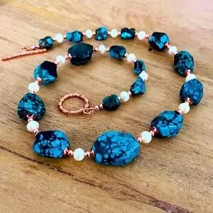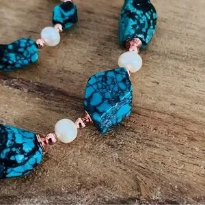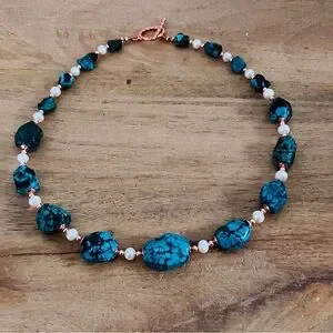This one of a kind artisan necklace features genuine, faceted turquoise nuggets and lustrous freshwater pearls… Solid copper spacer beads and textured toggle clasp complete the look.