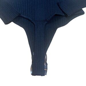 black ribbed bodysuit, women’s long sleeve bodysuit, zip front bodysuit, scoop neck bodysuit, cheeky bottom bodysuit, new with tag bodysuit, acrylic nylon polyester bodysuit, fitted rib knit bodysuit, versatile layering bodysuit, trendy black one piece,