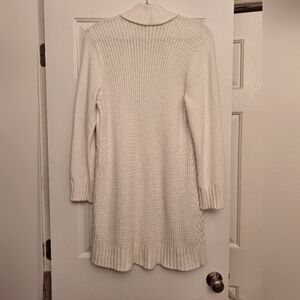 Chico's cardigan in a soft cream hue. Features a textured knit design. Ideal for layering and adding elegance. Beautiful with jeans and boots for the fall and winter seasons!