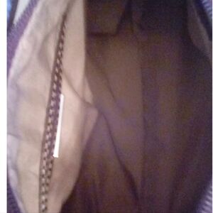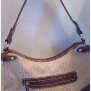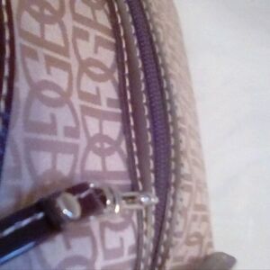 Gently used light tan with brown trim shoulder bag by Gianni Bernini. It has inside pocket and pouches exterior zippered pocket and zippered closure.