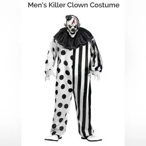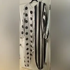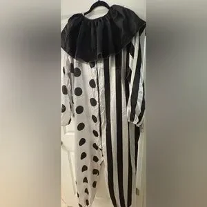 This playful clown costume features a striking black and white polka dot and stripe design. Perfect for parties and dress-up fun. This costume was only worn once and is in perfect used condition. No defects seen. This set includes bodysuit, mask, bib, and gloves. Make me an offer!!