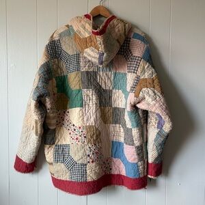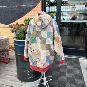 Handmade from a rustic, vintage hand-sewn quilt. Heavy cotton and wool batting with beautiful color fabric patches. Hand cut and reworked into a gorgeous, cozy and rustic farmhouse chore coat. Large kangaroo pouch at front and finished with a hood at the back. This garment is made from a very old quilt and should be treated with care. It has been washed and run through the dryer, but with each wash and dry it will become more faded and fragile. Handwash or gentle cycle only. Air dry only. Made with love by me!