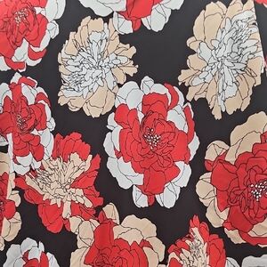 Elegant blouse with bold floral design. Features black base with red and cream flowers. Ideal for casual or formal wear.