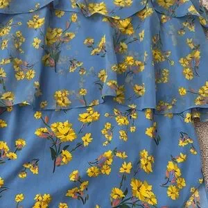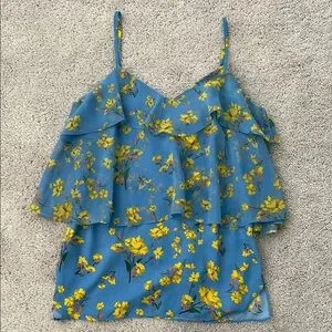 Beautiful and breezy designer floral top by Goen.J in a cheerful blue and yellow colorway. Features delicate ruffle detailing, a flattering tiered silhouette, and adjustable spaghetti straps. Size small (4) and in great condition.