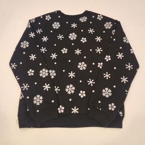 Black sweater featuring festive text and snowflakes. Vibrant holiday design. Batteries not included.